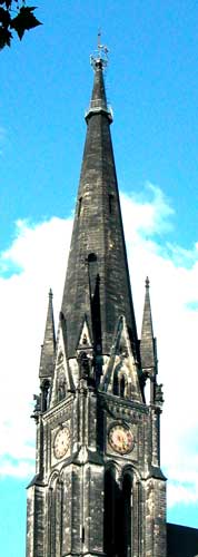 Auffällig ist die offene Helmspitze des Kirchturms.